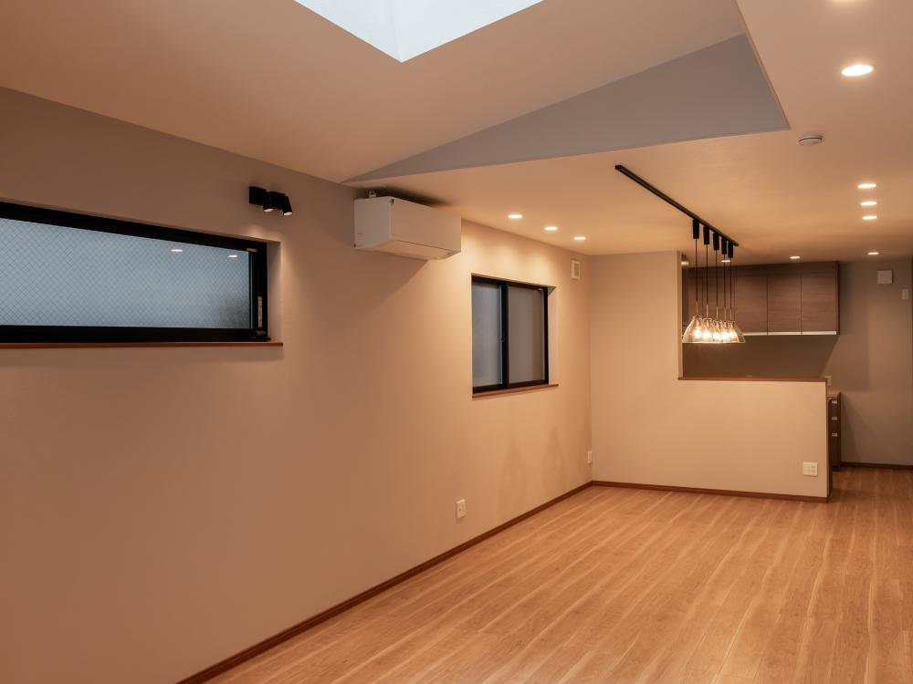 敷地の高低差を活かし、LDKにスキップフロアを設けた住宅です。吹き抜けを活かしてダイニングや階段からリビングを見渡すことがき、家族全体のつながりを常に感じることができます。